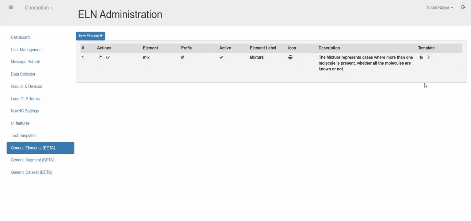 In the administration account, in the Generic Elements page, the element appears in the elements list (not to be confused with the elements list in the Chemotion ELN). The elements list includes all the elements generated by the admin’s account, along with their attributes and further functions. The elements are sorted alphabetically by status (active first), element label, and description.