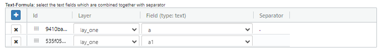 A Text-Formula type field provides a dynamic text output by combining multiple Text fields from this and other layers in one display. This field type is useful when you want to display a text that is a combination of multiple Text fields.The Text fields can be separated by different separators like space, comma, etc. The default separator is a dot (.).