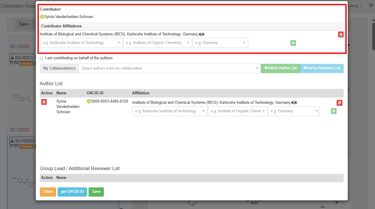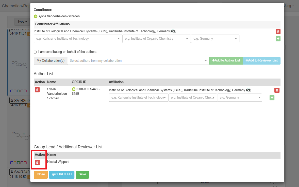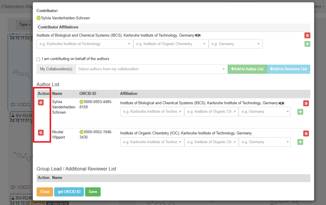 After clicking the Authors & Reviewers button, at the top of the interface, you can delete existing affiliations or add new affiliations for the contributor.