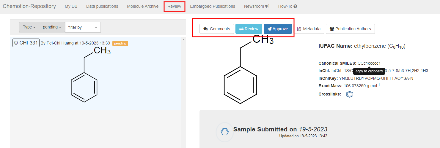 (1) The review can be done directly on the main page of the submitted reaction or sample.